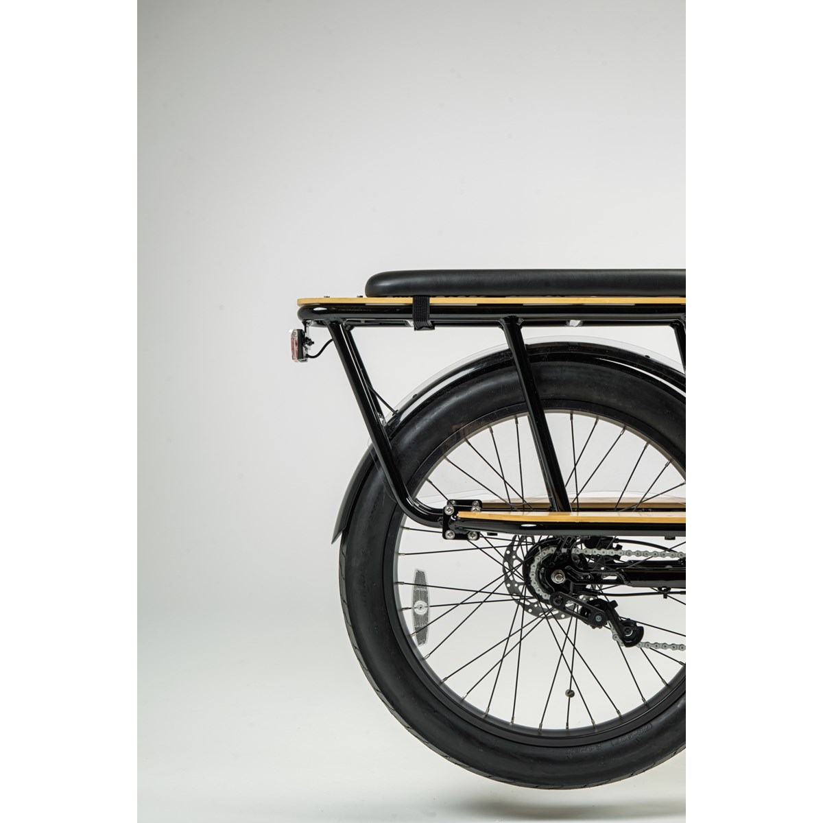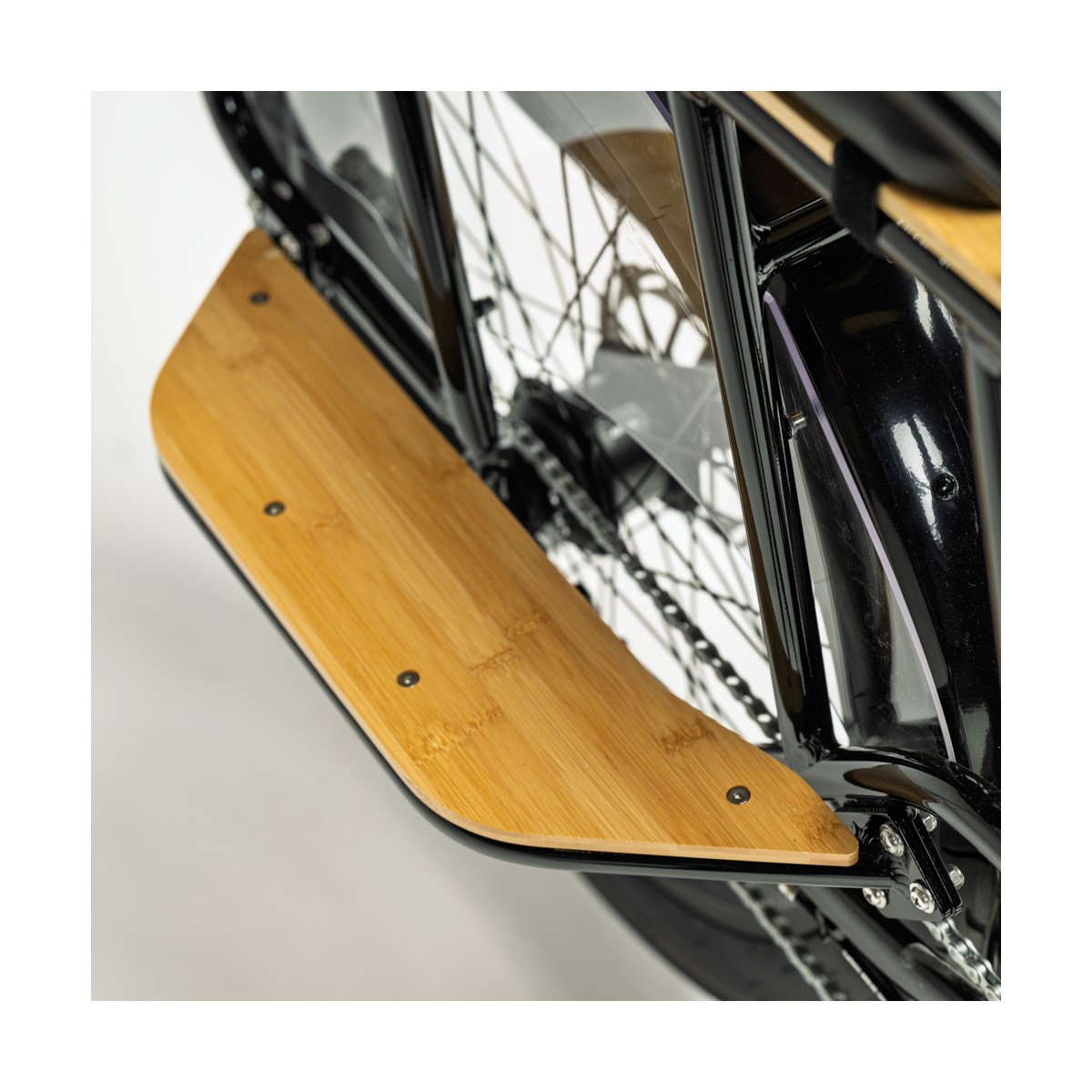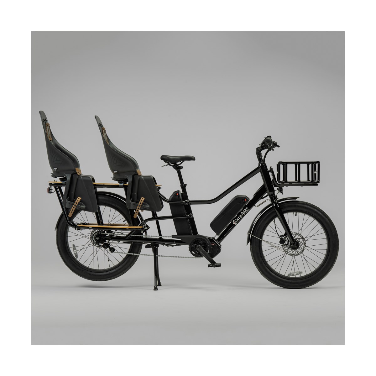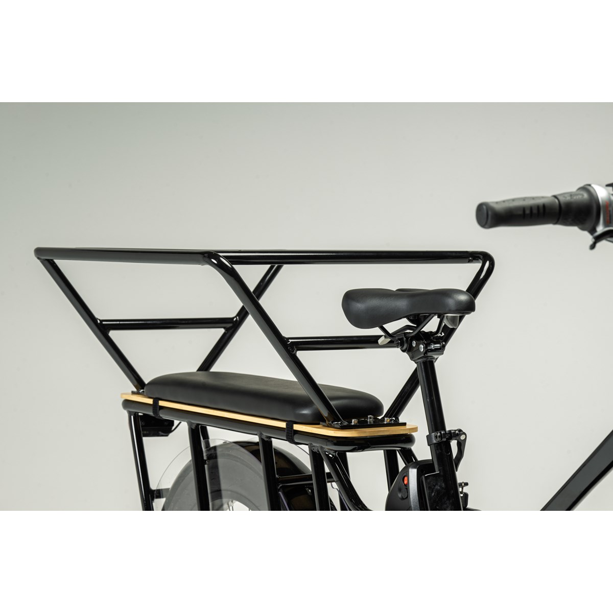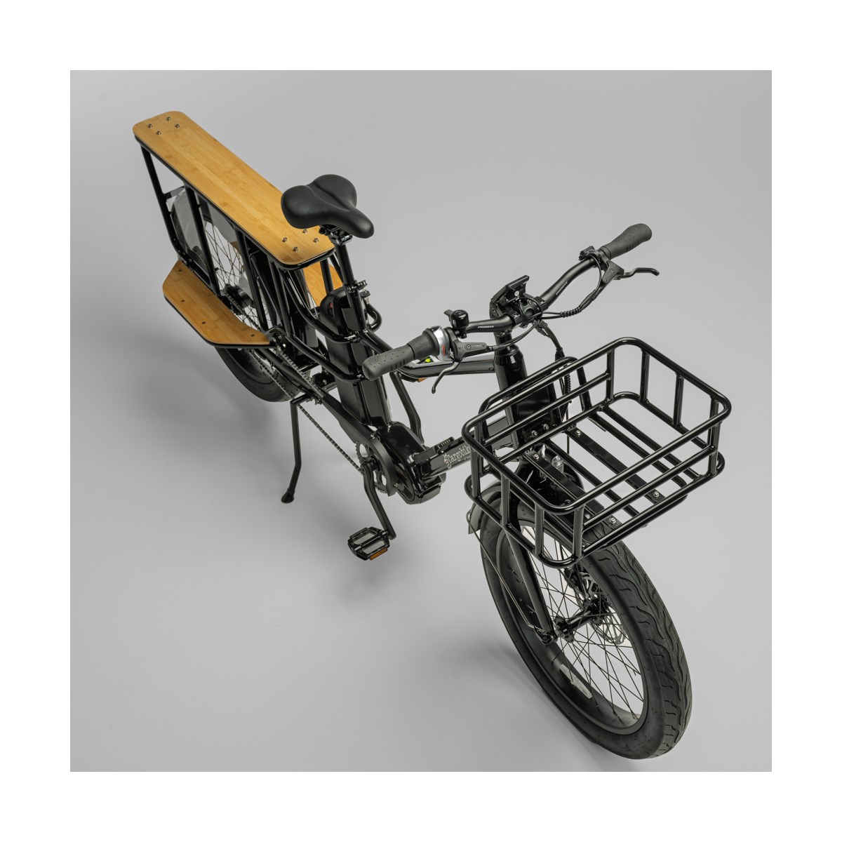 In de basisuitvoering beschikt de Longtail Varia over een stevige achterbank met een zacht en comfortabel zitkussen. Bij het achterwiel is een vaste voetensteun geïntegreerd, zodat kinderen stabiel en veilig kunnen zitten. Voor wie nog meer zekerheid wil, is er een optionele veiligheidsmand met zijrails beschikbaar. Die mand biedt plaats aan twee kinderen en geeft extra bescherming rond het zitgedeelte. Je kunt bovendien tot twee kinderzitjes op de achterbank installeren, waardoor de fiets perfect meegroeit met jouw gezin.