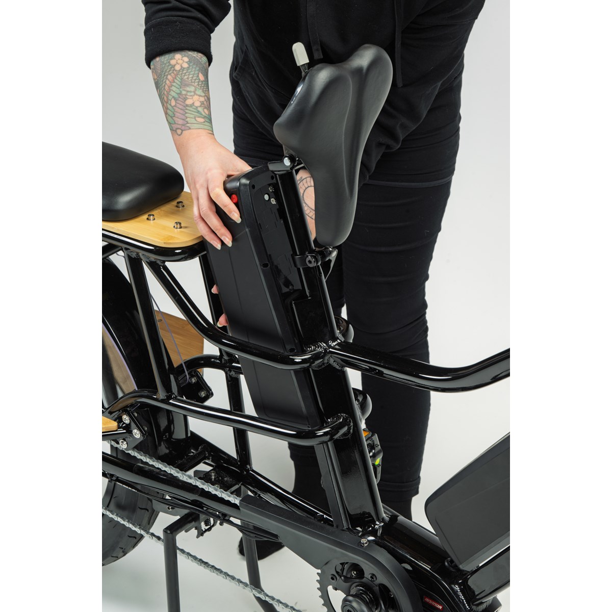 Onder de bagagedrager zit een krachtige 20Ah accu die je een ruime actieradius van ongeveer 60 km biedt, afhankelijk van terrein en rijstijl. Ideaal voor langere gezinsritten of een dag pendelen zonder tussendoor te laden. Wie nóg verder wil gaan, kan gebruikmaken van de aansluiting voor een tweede accu, zodat de totale actieradius merkbaar wordt vergroot.